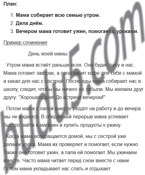 Напиши сочинение на тему ”День моей мамы” (моего папы, бабушки, сестры...). Расскажи, что обычно делает мама (или тот, о ком ты пишешь) утром, днём, вечером.