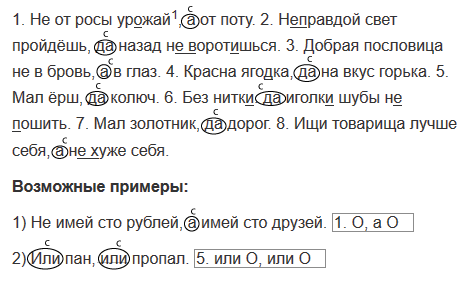 1. Не от росы ур..жай1 а от поту. 2. (Не)правдой свет пройдёшь да назад (не)ворот..шься. 3. Добрая пословица не в бровь а в глаз. 4. Красна яго..ка да на вкус горька.4 5. Мал ёрш да колюч.4 6. Без нитк.. да иголк.. шубы (не)пошить. 7. Мал золотник да дорог.4 8. Ищи товарища лучше себя а (не)хуже себя.