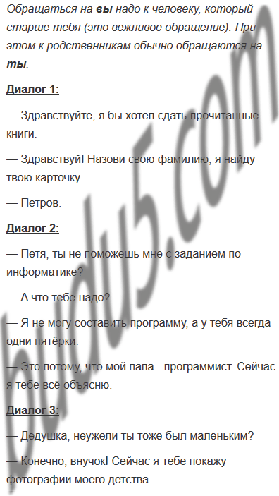 Рассмотрите рисунки. Придумайте собеседникам имена. Составьте диалоги к каждой изображённой на рисунках ситуации. Кто из собеседников, по вашему мнению, будет обращаться к другому человеку на вы, а кто — на ты? Один из диалогов запишите.