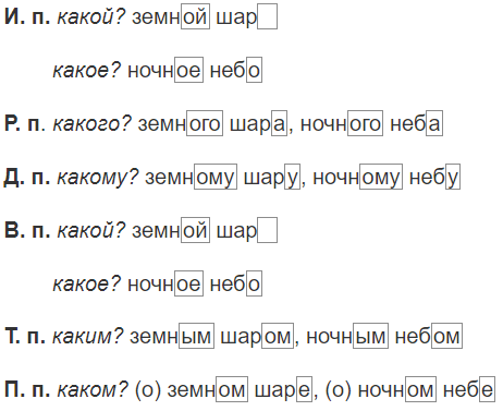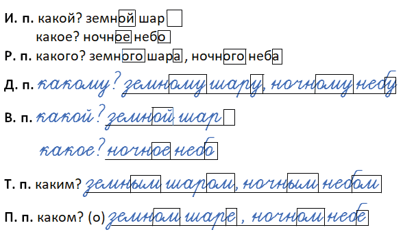 Прочитайте. Впишите пропущенные вопросы. Продолжите склонение имён прилагательных и имён существительных. Выделите в словах окончания.