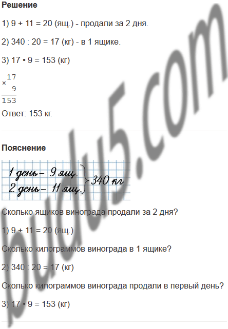 20. В первый день в киоске продали 9 одинаковых по массе ящиков винограда, а во второй - 11 таких же ящиков. Сколько килограммов винограда продали в первый день, если всего за два дня продали 340 кг винограда?
