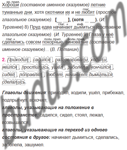 1) Сын приходил с занятий возбуждённый усталый запылившийся загорелый садился и они разговаривали о городе о знакомых друзьях. (Н. Тихонов) 2) Все на миноносце с утра ходили молчаливые и хмурые. (Л.Соболев) 3) Тимофеев явился усталый и равнодушный. (С. Антонов) 4) Мы простились. Я ушёл расстроенный злой и в гостинице у меня в первый раз в жизни заболела голова. (В. Каверин) 5) День кончился не порывом ветра а последним лёгким дыханием. (М. Пришвин) б) Иван Павлыч сидел очень красный и время от времени растерянно поправлял усы. (В. Каверин) 7) Хороши летние туманные дни, хотя охотники их и не любят. (И. Тургенев) 8) Пруд едва начинает дымиться. (И. Тургенев) 9) Глаза у неё сделались совсем покорные, виноватые... (В. Потанин)