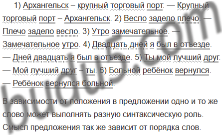 1) Архангельск крупный торговый порт. — Крупный торговый порт Архангельск. 2) Весло задело плечо. — Плечо задело весло. 3) Утро замечательное. — Замечательное утро. 4) Двадцать дней я был в отъезде. — Дней двадцать я был в отъезде. 5) Ты мой лучший друг. — Мой лучший друг ты. 6) Больной ребёнок вернулся. — Ребёнок вернулся больной.