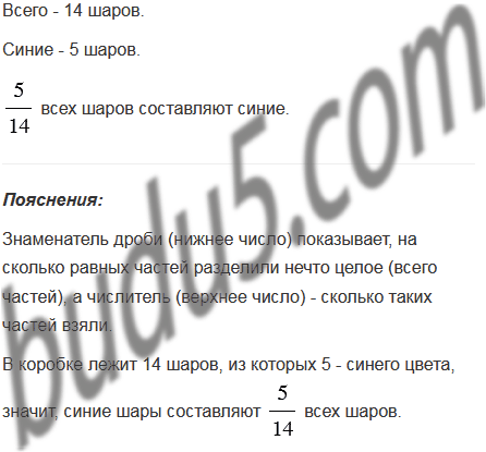 В коробке лежит 14 шаров, из которых 5 - синего цвета. Какую часть всех шаров составляют синие?