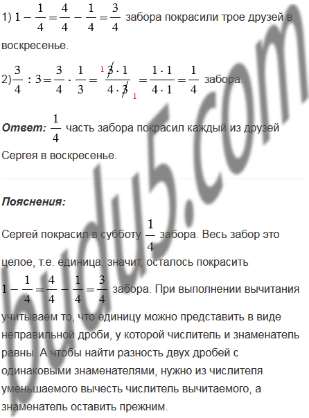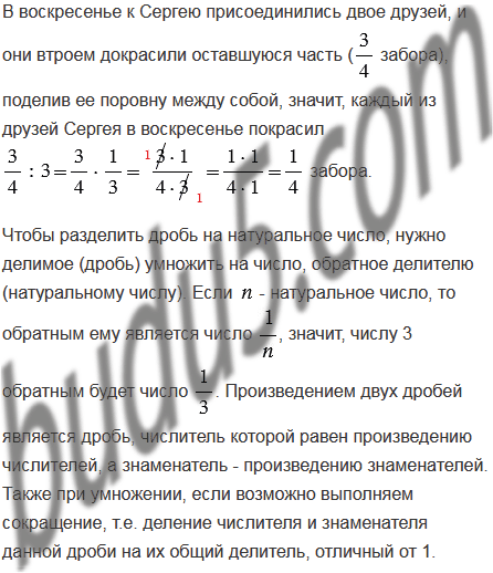 забора. В воскресенье к нему присоединились двое друзей, и они с Сергеем докрасили оставшуюся часть, поделив ее поровну между собой. Какую часть забора покрасил каждый из друзей Сергея в воскресенье?