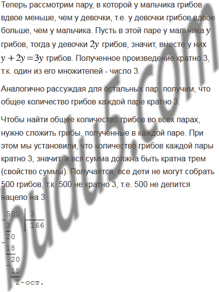 Дети собирали в лесу грибы. Выйдя из леса, они построились парами - мальчик с девочкой, причем у мальчика грибов или вдвое больше, или вдвое меньше, чем у девочки. Возможно ли, что все дети собрали 500 грибов?