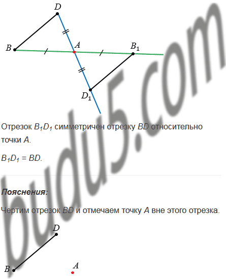 Начертите отрезок ВD и отметьте точку А вне этого отрезка. Постройте отрезок, симметричный отрезку ВD относительно точки А. Сравните полученный отрезок и отрезок ВD.