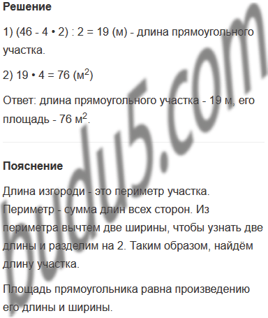 Задание № 108. Длина изгороди вокруг прямоугольного участка земли равна 46 м. Ширина участка 4 м. Чему равны его длина и площадь?