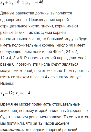 Чтобы выполнить некоторое производственное задание, одному рабочему требуется на 12 ч меньше, чем другому, и на 4 ч больше, чем обоим рабочим для совместного выполнения задания. За сколько часов может выполнить это задание первый рабочий?