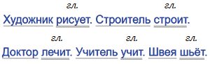 Учит, шьёт, лечит, строит, рисует. В данной группе все слова являются глаголами, поскольку обозначают действия и отвечают на вопрос что делает?